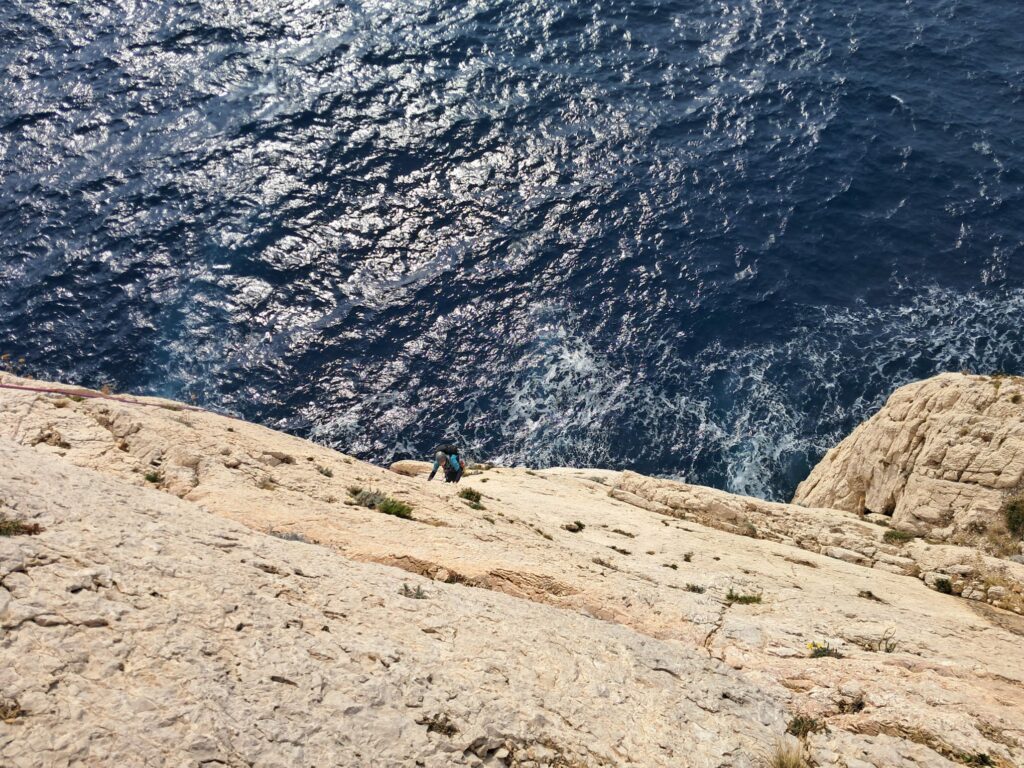 Le samedi, retour à la calanque de Sormiou où nous avons réalisé l’Hallu Nulle. Comme pour Etron Fou, nous avons démarré à quelques mètres au-dessus de la mer. Cette voie, la plus grande que nous ayons faite, concluait à merveille notre séjour avec ses 135m de haut.