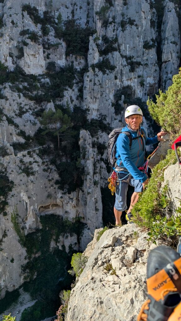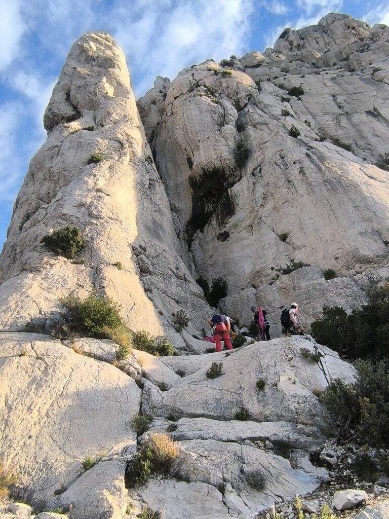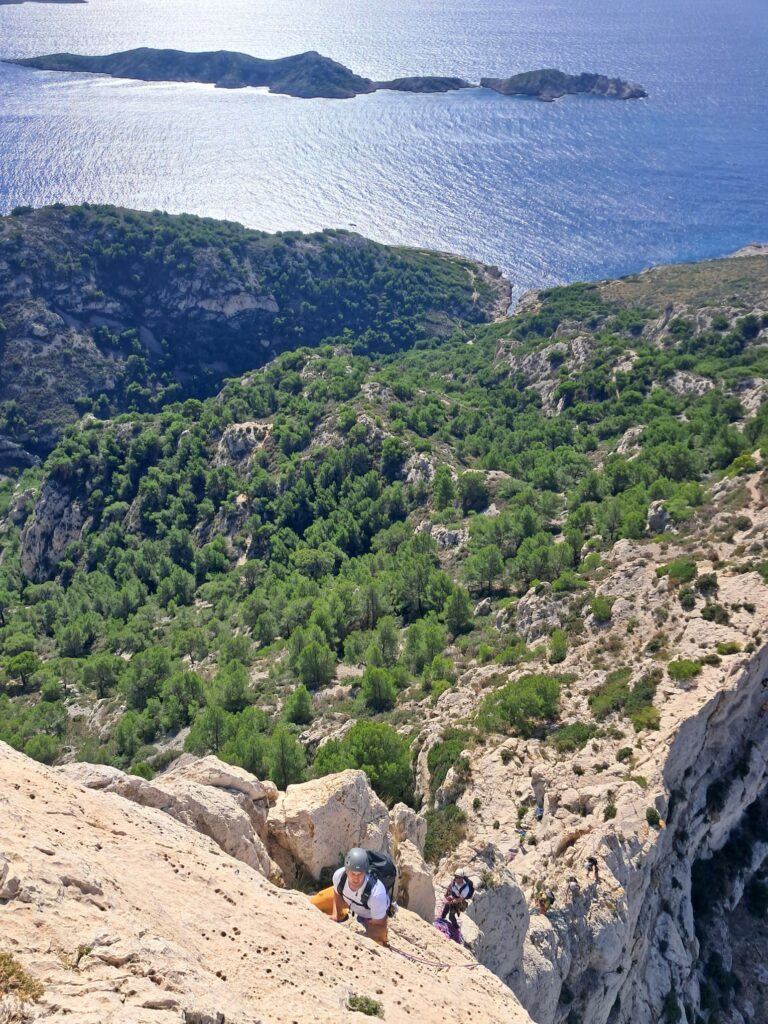 Nous étions 5 grimpeurs à partir pour Marseille le samedi 18 octobre 2025 : Dirk en tant qu’encadrant, Nathalie, David, Thierry et Teddy. Arrivés à notre location vers 15h, nous nous sommes installés puis nous avons profité du reste de l’après-midi pour préparer nos sorties. Notre objectif sur la semaine était d’accéder à l’autonomie en grande voie : préparer sa course, s’orienter lors de la marche d’approche, savoir fabriquer son relais et faire monter son second, être capable de s’engager malgré la difficulté ou la distance entre les points.