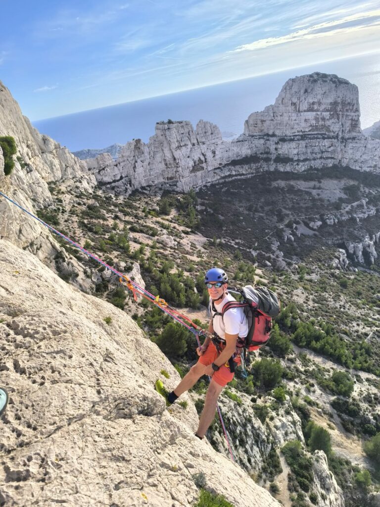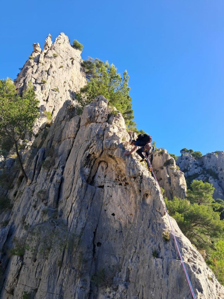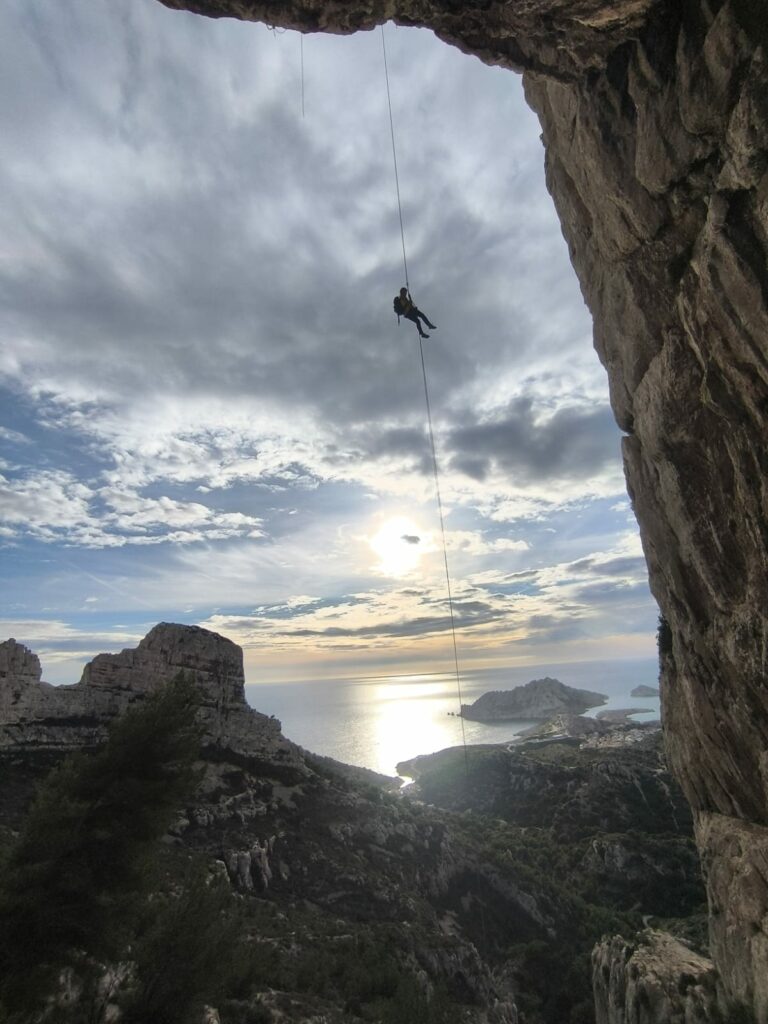 Le mercredi, nous nous sommes dirigés vers la calanque des Goudes, pour grimper l’Arête de la Cordée. Cette grande voie offrait une vue imprenable sur la mer. Sa troisième longueur proposait également un bon challenge avec sa traversée impressionnante puis sa dalle technique. Enfin, la descente en rappel, en fil d’araignée aux abords de la grotte de l’ermite a été un nouveau moment d’émotion.